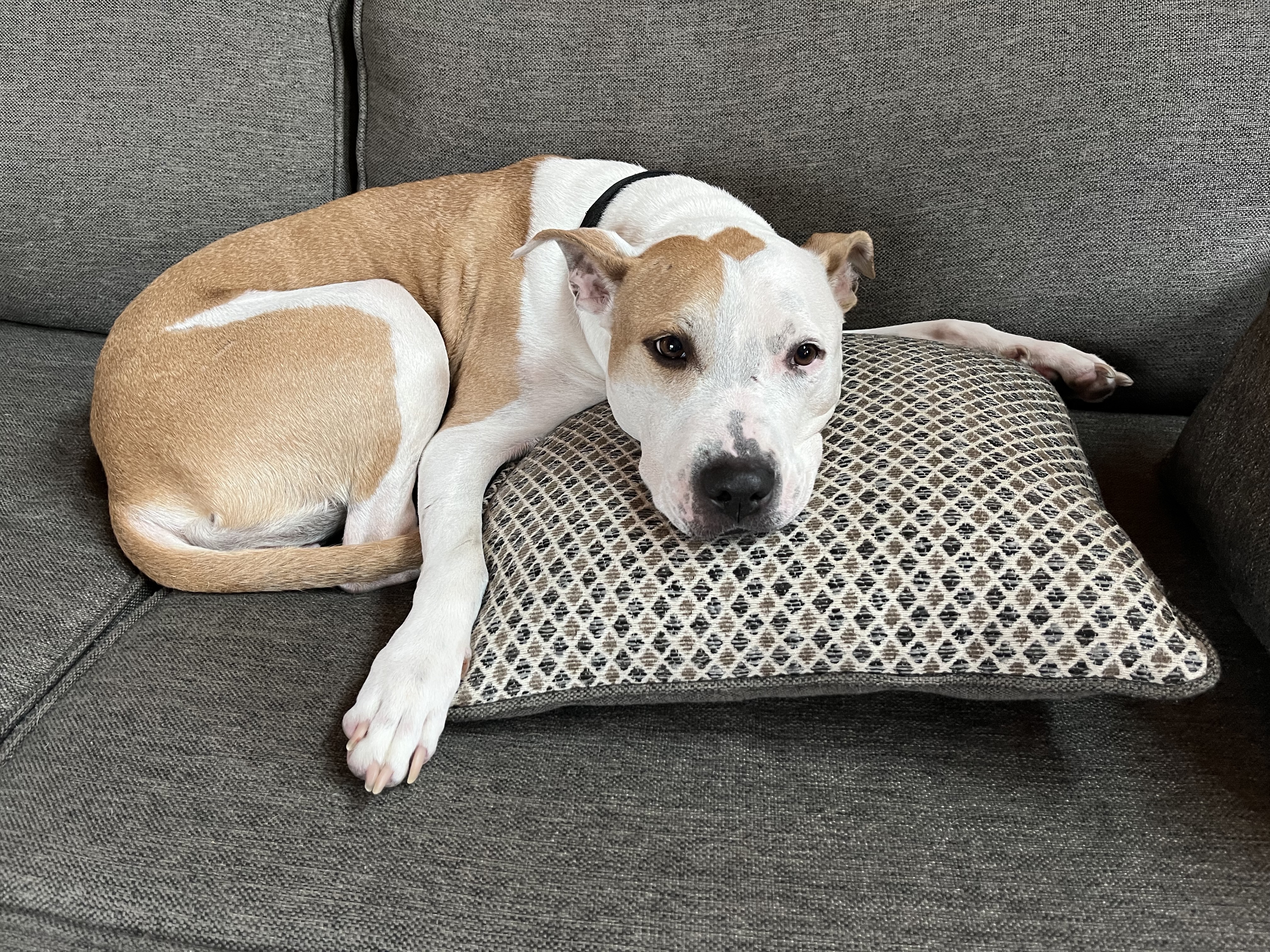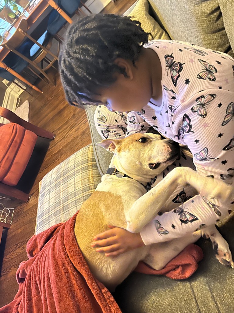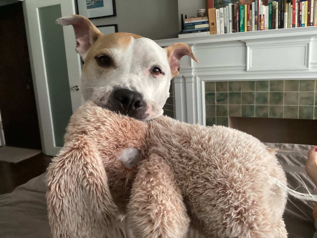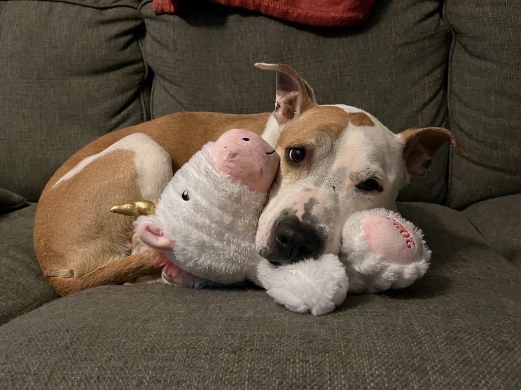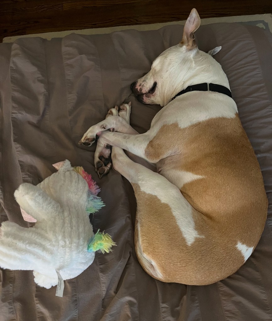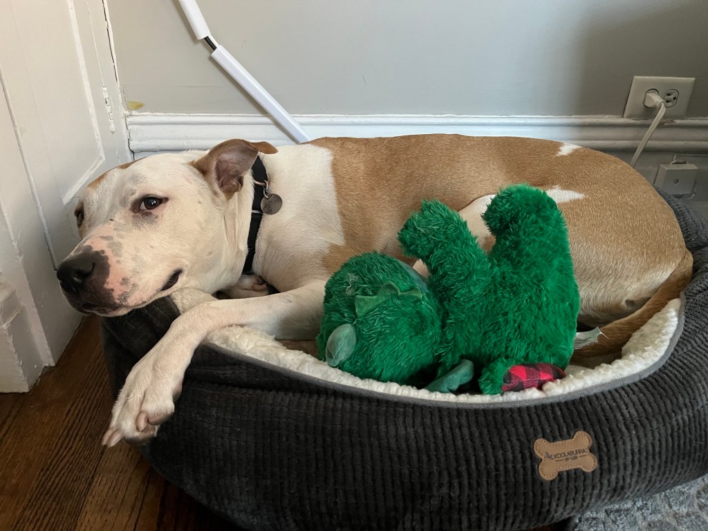 Dahlia loved fiercely her chosen few — my parents, my (former) foster kiddo, and some shelter employees. She hated fiercely other dogs and was scared of strangers. She bit a kid and bit another dog. No one was really injured but that fear I had of her biting someone else and the hostage feeling I had in my home knowing others couldn’t come over told me I couldn’t live like that anymore. I zoomed out, frantically talking to rescue centers, Bruno’s former vet, and dog behaviorists — all of whom told me not to adopt her. It was too risky. Damn, do I love this dog, though. The best cuddler, the sweetest giant lap dog, and the balm to my broken heart after Bruno died.